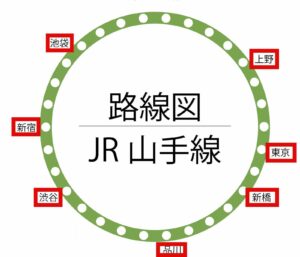 下の山手線の路線図を見て、まず最初から知っている駅名の位置をご確認ください。